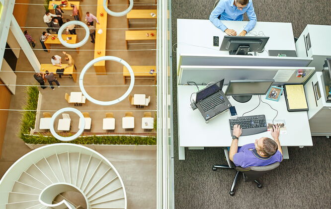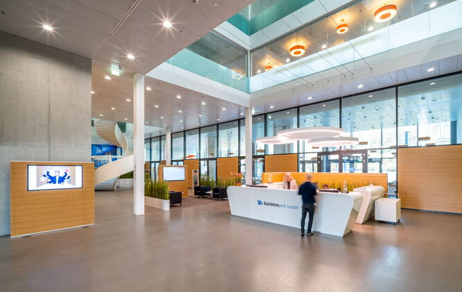 Alles an diesem Gebäude kann sich sehen lassen. Raumhohe Fensterfronten dominieren das reduzierte Äussere. Die moderne Architektur mit ihrer klaren Formsprache setzt sich im Inneren fort, ergänzt durch Elemente in warmen Farbtönen, einem raffinierten Lichtkonzept und Designobjekten. Das schafft eine helle, freundliche Atmosphäre, in der sich produktiv arbeiten lässt. Ihre Kunden und Gäste werden Termine mit Freude bei Ihnen wahrnehmen.